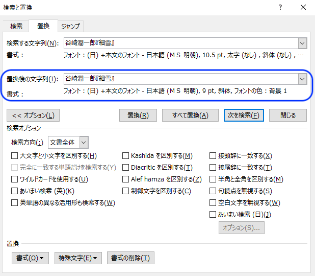 書式を置き換える文字列 : 谷崎潤一郎『細雪』 置き換えた後の書式 : 「斜体」「サイズ:9」「色:グレー」 |