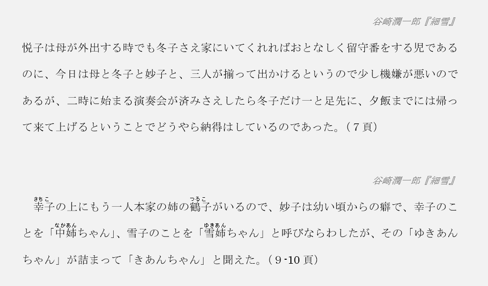 例文に谷崎潤一郎『細雪』(中公文庫)を使用します。中公文庫版は『細雪』を全1巻で楽しみたい方におすすめです。